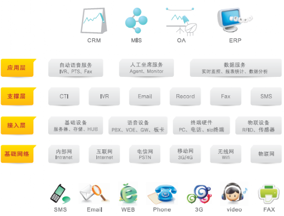 我们使用Avaya、NEC交换机,支持传统电话、传真、短信、Email、线下渠道的接入,同时也支持WEB、微信、微博、APP等移动互联网的接入。